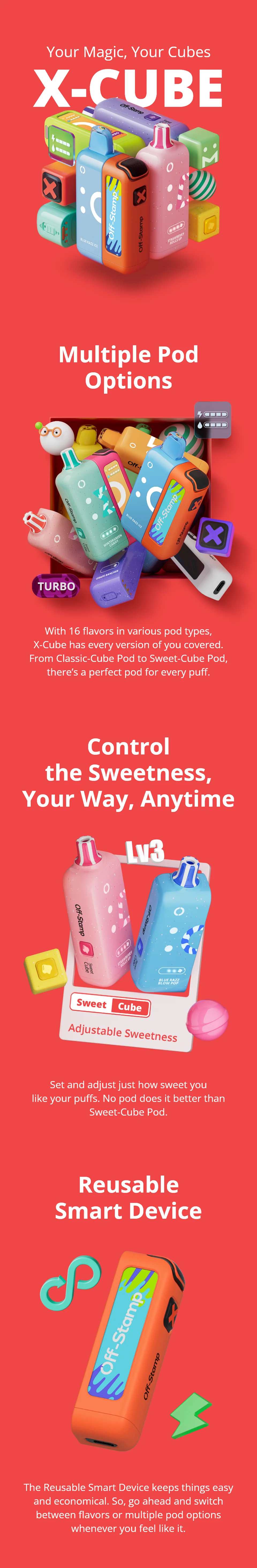 The Off-Stamp X-Cube 25K Disposable Kit, featuring a 25,000-puff capacity, a 1000mAh rechargeable battery, and advanced smart display technology for an unbeatable vaping experience.